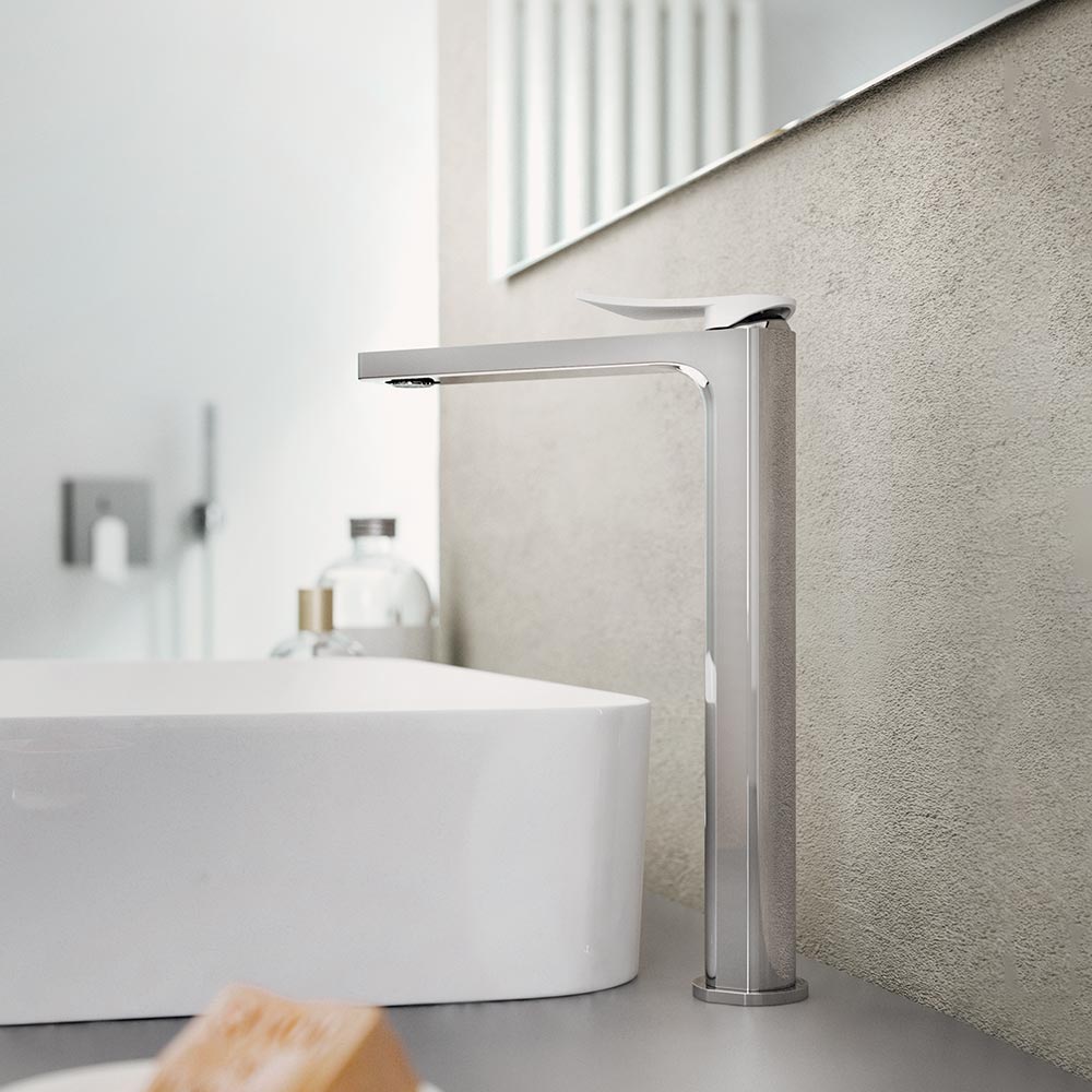 Miscelatore lavabo alto con piletta regolabile con tappo a scatto, flex inox di alimentazione.
