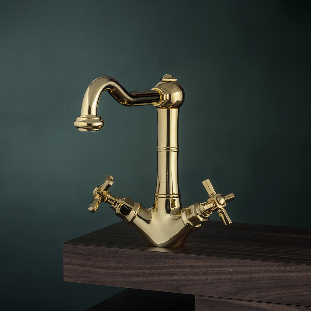 ORO 24 KT Monoforo lavabo con bocca girevole, scarico automatico e flex inox di alimentazione.